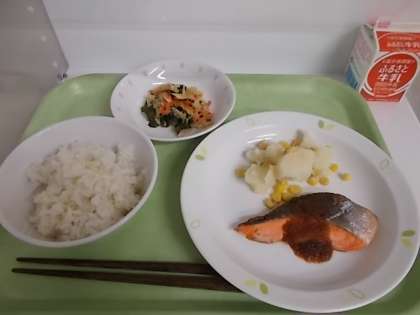 献立は、麦ごはん、牛乳、鮭のステーキソース、コーンポテト、わかめサラダでした。