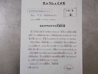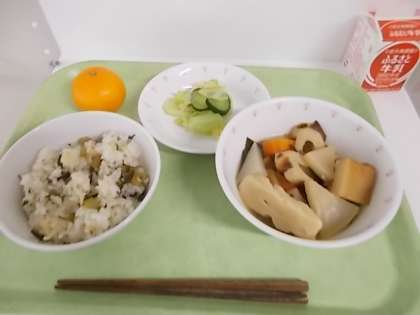 献立は、菜めし、牛乳、大蔵大根のおでん、ひとしお野菜、みかんでした。