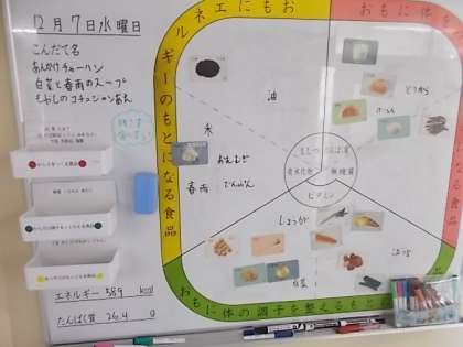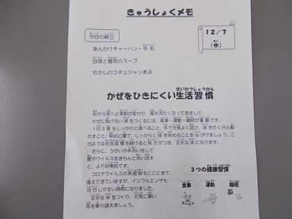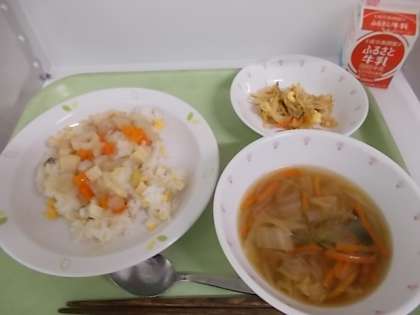 献立は、あんかけチャーハン、牛乳、白菜と春雨のスープ、もやしのコチュジャンあえでした。
