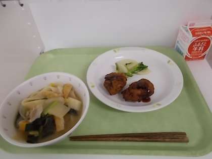 献立は、ほうとう、牛乳、たこ揚げ、かぶのゆず風味でした。