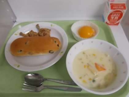 献立は、ぶどうパン、牛乳、フライドチキン、コーンシチュー、おかしな目玉焼きでした。