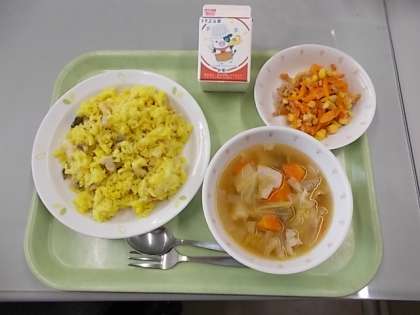 献立は、パエリア、牛乳、白いんげんの田舎風スープ、にんじんサラダでした。