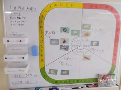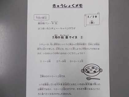 献立は、黒砂糖パン、牛乳、さつまいもシチュー、キャベツサラダでした。