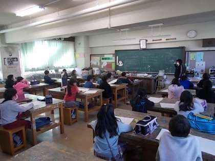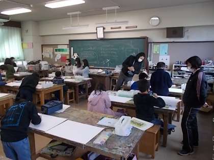 授業の様子(1月25日) 公開日 2023/01/25 更新日 2023/01/25 今日のできごと 3年1組の3校時の様子(図画工作)です。 題材名「にじ色にじみ世界のまち」 本時の目標「『にじ色にじみ世界のまち』のイメージをもち、表したいことに合わせて形や色、滲ませ方を工夫して表す。」