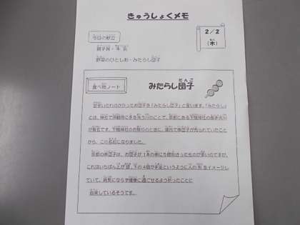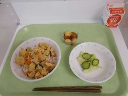 献立は、親子丼、牛乳、野菜のひとしお、みたらし団子でした。
