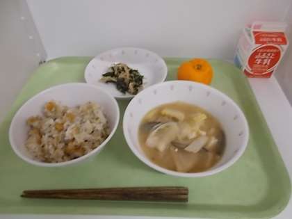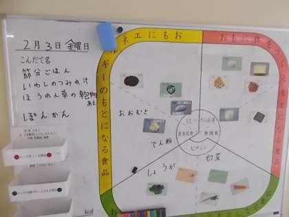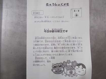 献立は、節分ごはん、牛乳、いわしのつみれ汁、ほうれん草の乾物あえ、くだもの(ぽんかん)でした。