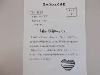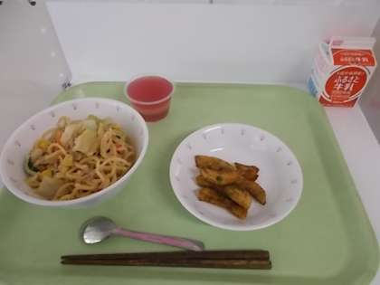 献立は、みそラーメン、牛乳、青のりフライドポテト、レインボーゼリーでした。