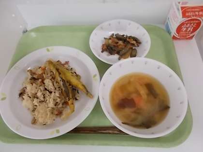 献立は、ひじきごはん、牛乳、ししゃものカレー揚げ、くきわかめのきんぴら、みそ汁でした。
