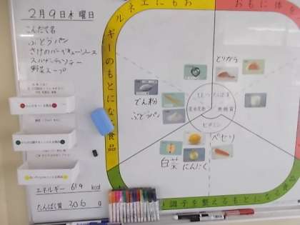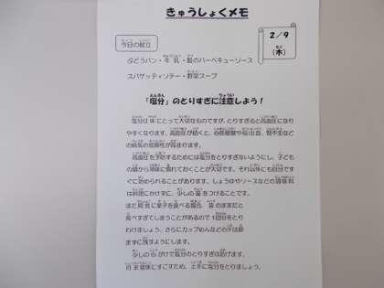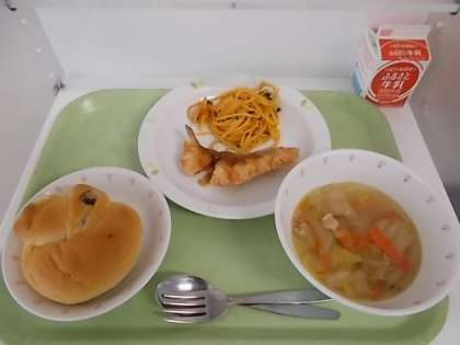 献立は、ぶどうパン、牛乳、鮭のバーベキューソース、スパゲッティソテー、野菜スープでした。