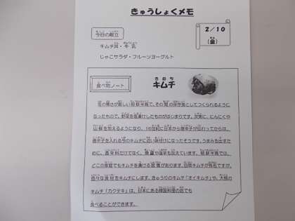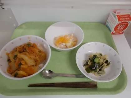 献立は、キムチ丼、牛乳、じゃこサラダ、フルーツヨーグルトでした。