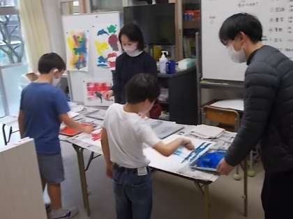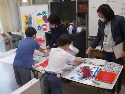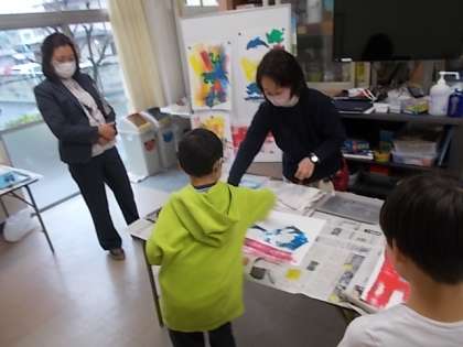 授業の様子(2月13日) 公開日 2023/02/13 更新日 2023/02/13 今日のできごと こもれび学級(2・3年)の5校時の様子(図画工作)です。 題材名「ころころローラー、うつしてあそぼう」 題材の目標「ローラーを転がしてできる線や色の重なりのおもしろさを味わいながら、楽しく取り組もうとしている」「型紙の繰り返しや重なりの違いに気付き、型紙版画のうつし方を試しながら自分の思いを表すことができる」