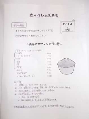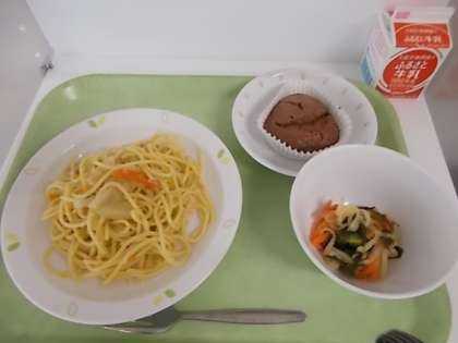 献立は、キャベツとツナのスパゲッティ、牛乳、わかめサラダ、おからマフィンでした