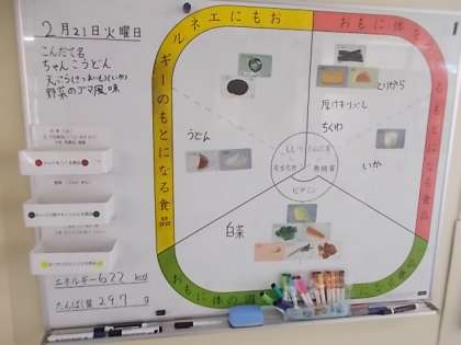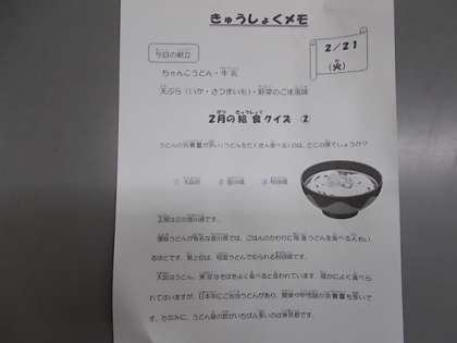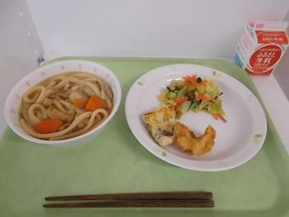 献立は、ちゃんこうどん、牛乳、天ぷら(いか・さつまいも)、野菜の胡麻風味でした。
