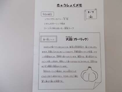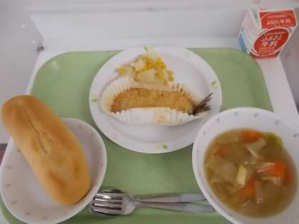 献立は、ソフトフランスパン、牛乳、いわしのガーリック焼き、コーン入り粉ふきいも、野菜スープでした。