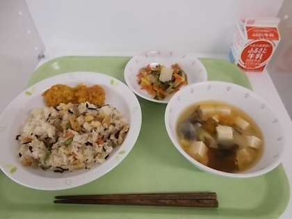 献立は、豆入りひじきごはん、牛乳、いかのカレーてんぷら、油揚げと野菜の煮びたし、みそ汁でした。