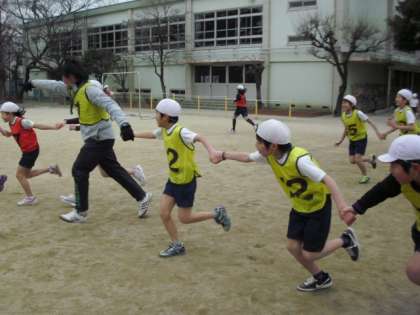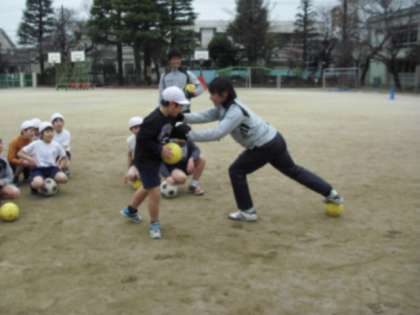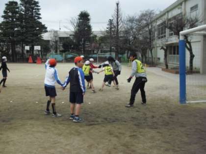今日は「東京ヴェルディ」の方をお招きして、5年生とのサッカー交流会が行われました。気温が低かったので、まず鬼ごっこをして身体を温めました。続いて、ボールの蹴り方・止め方など基礎的なことを学び、最後には友達と手をつないでボールを追いかけ、シュートするというゲームを楽しみました。教え方が工夫されていて、子ども達は真剣に話を聞いたり考えたりしていました。笑顔と歓声が、いっぱいでした。