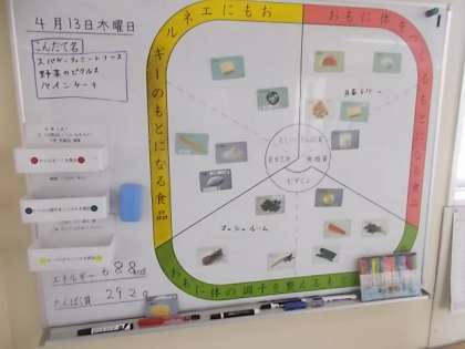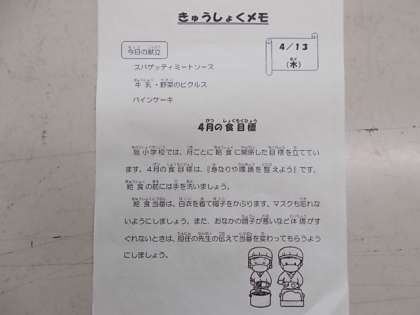 献立は、スパゲッティミートソース、牛乳、野菜のピクルス、パインケーキでした。