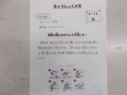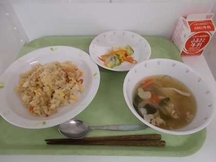 献立は、チャーハン、牛乳、辣白菜、ワンタンスープでした。