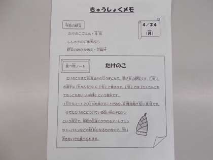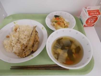 献立は、たけのこごはん、牛乳、ししゃものごま天ぷら、野菜のおかかあえ、豆腐汁でした。