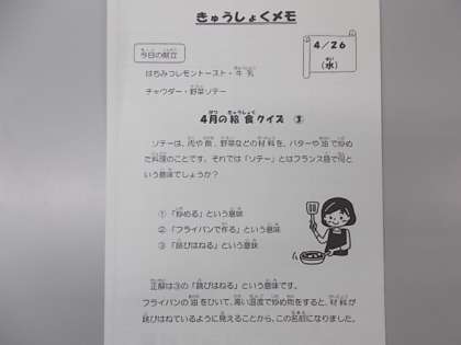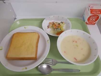 献立は、はちみつレモントースト、牛乳、チャウダー、野菜ソテーでした。