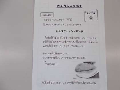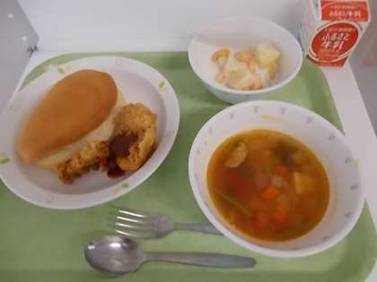 献立は、セルフフィッシュサンド・牛乳・豆入りミネストローネ、フルーツヨーグルトでした。