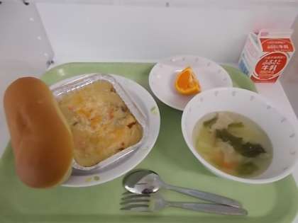 献立は、あしたばパン、牛乳、豆乳入りポテトグラタン、野菜スープ、マンダリンオレンジでした。