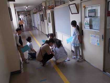 1年2・3組、2年2・3組が1・2校時に「学校たんけん」を行いました。