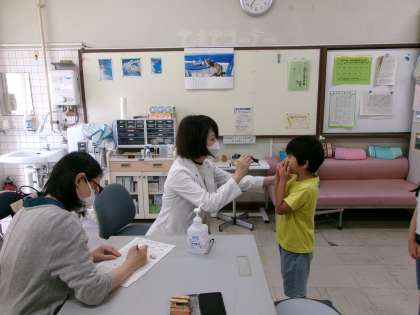 眼科検診(5月18日) 公開日 2023/05/18 更新日 2023/05/18 今日のできごと 今日は、眼科検診です。初めての1年生は少し緊張気味ですが、上手に「あかんべー」ができました。 4月から始まった定期健康診断も終盤。残すは4年希望者の色覚検査と5年生の内科検診だけとなりました。