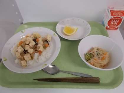 献立は、西湖豆腐丼、牛乳、春雨サラダ、ニューサマーオレンジでした。