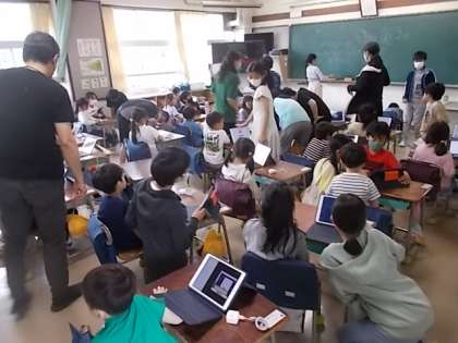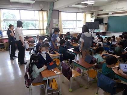 授業の様子(5月31日) 公開日 2023/05/31 更新日 2023/05/31 今日のできごと 1・6年生の5校時の様子です。 1年生のタブレット各種設定を6年生が面倒を見ています。 写真上から1の1、1の2、1の3です。