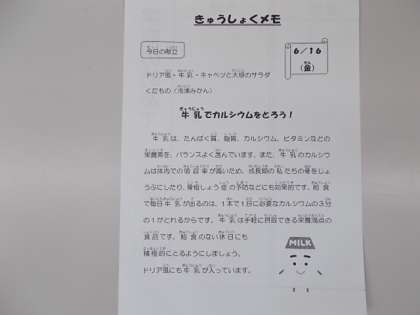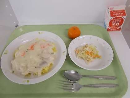 ドリア風、牛乳、キャベツと大根のサラダ、冷凍ミカンでした。