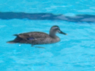 プール開きの最中にカモが飛来し、2年児童の前で泳ぎを披露しました。