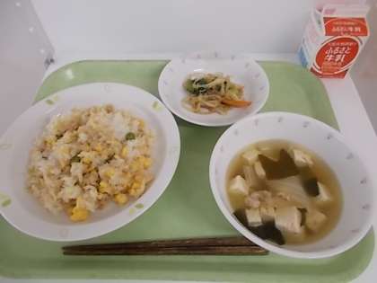 献立は、そぼろごはん、牛乳、野菜のごまだれあえ、豆腐汁でした。