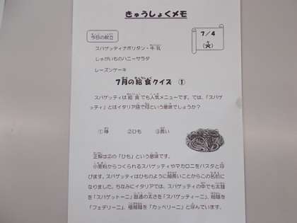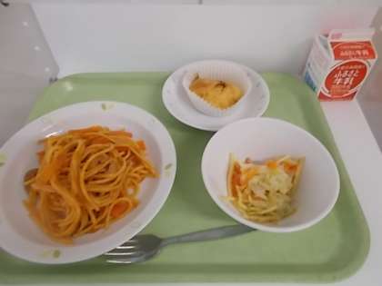 献立は、スパゲッティナポリタン、牛乳、じゃがいものハニーサラダ、レーズンケーキでした。