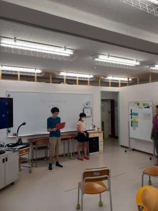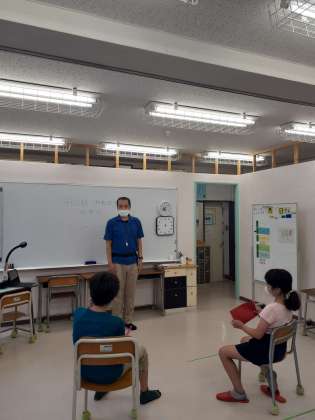 まず、教室に集合し、出発式をしました。二人は、自分のめあてを宣言、見送りの人たちから頑張ってねと拍手をもらいました。最後にサプライズ動画の紹介がありました。なんと、交流学級の皆さんから、「楽しんできてね」「行ってらっしゃい!」のメッセージでした。わぁ!っと歓声を上げ、喜びました。