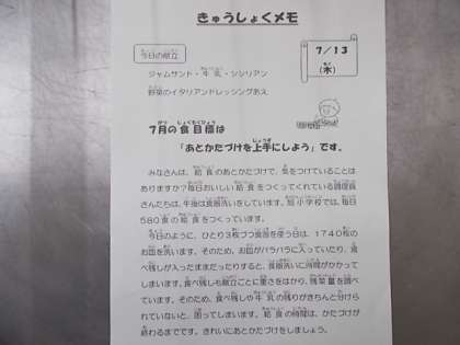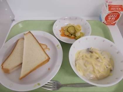 献立は、ジャムサンド、牛乳、シシリアン、野菜のイタリアンドレッシングあえでした。