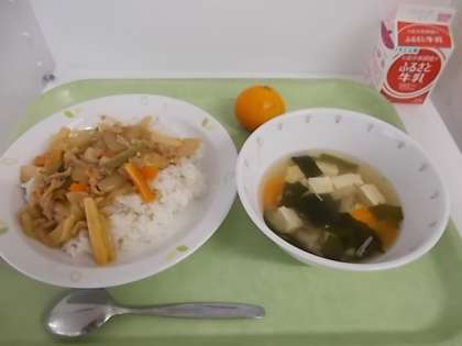 献立は、スタミナ丼、牛乳、豆腐とわかめのスープ、冷凍みかんでした。