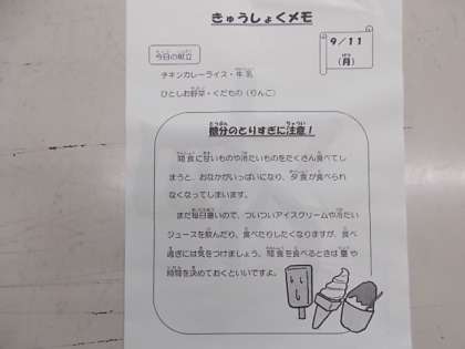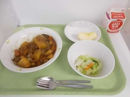 献立は、チキンカレーライス、牛乳、ひとしお野菜、りんごでした。