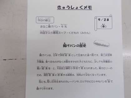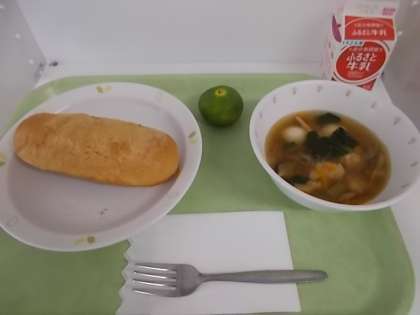 献立は、きなこ揚げパン、牛乳、肉団子入り春雨スープ、みかんでした。