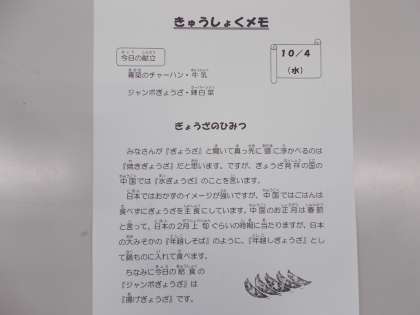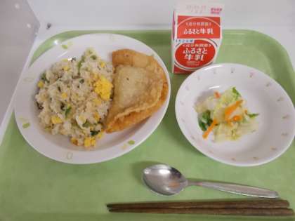 献立は、青菜のチャーハン、牛乳、ジャンボ餃子、辣白菜でした。