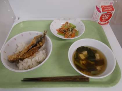 献立は、いわしのかば焼き丼、牛乳、野菜のおかかあえ、すまし汁でした。