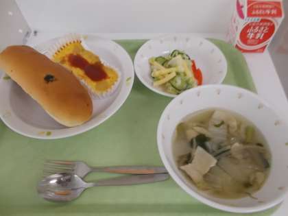 献立は、ぶどうパン、牛乳、スペイン風オムレツ、マカロニサラダ、白菜のスープでした。
