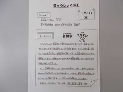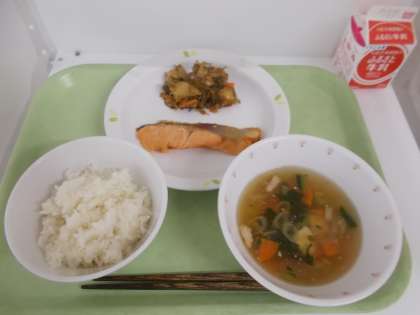 献立は、有機米のごはん、牛乳、鮭の西京焼き、きざみ昆布の五目煮、吉野汁でした。