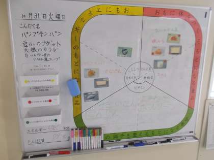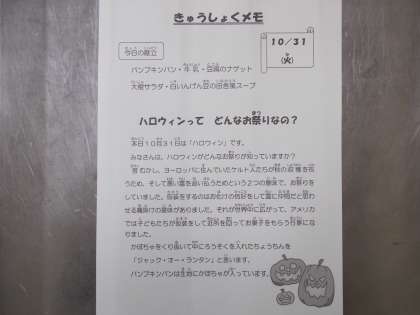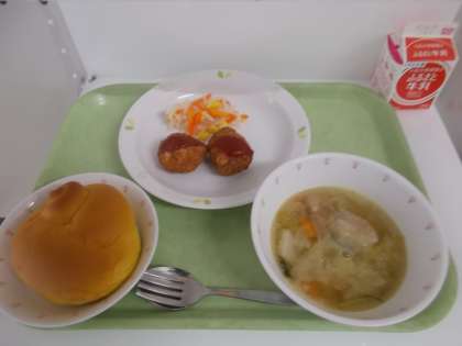 献立は、パンプキンパン、牛乳、豆腐のナゲット、大根サラダ、白いんげん豆の田舎風スープでした。