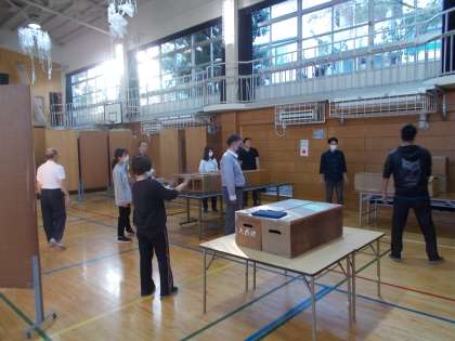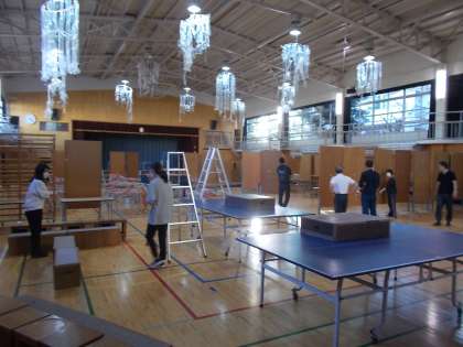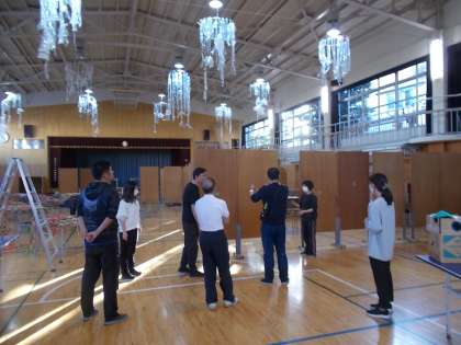 児童下校後、展覧会を担当している教員で会場を整えています。