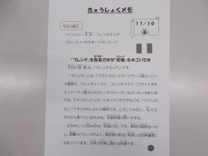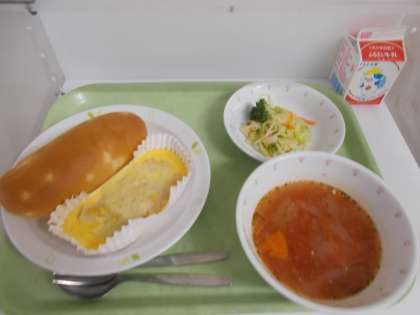 献立は、パインパン、牛乳、フレンチエッグ、ブロッコリーサラダ、トマトスープでした。