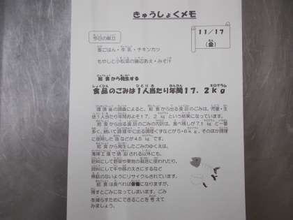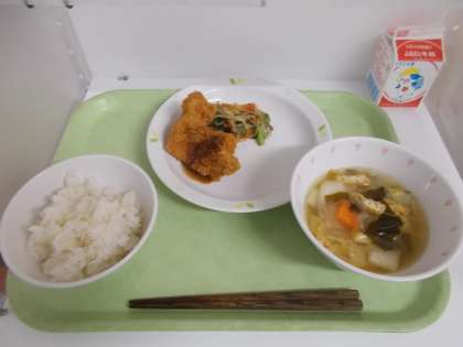 献立は、麦ごはん、牛乳、チキンカツ、もやしと小松菜の磯辺あえ、みそ汁でした。