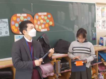 写真上、中…駒繋小学校の授業を参観している旭小教員