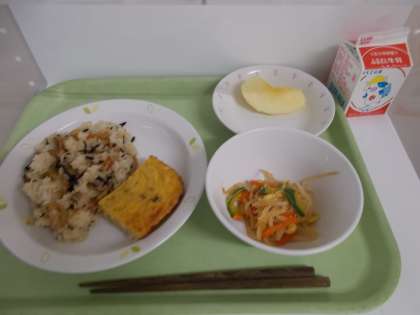 献立は、ひじきごはん、牛乳、切干し大根の卵焼き、大豆もやしのコチュジャンあえ、りんごでした。