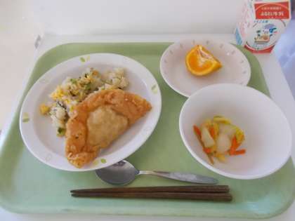 献立は、青菜の炒飯、牛乳、ジャンボ餃子、辣白菜、早香(温州みかんとポンカンを交配した品種)